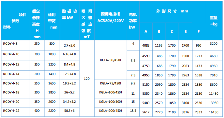 四、RCDY-J系列懸掛式組合回收型除鐵器主要技術(shù)參數(shù)、外形尺寸     執(zhí)行標(biāo)準(zhǔn):JB/T7689、JB/T10885