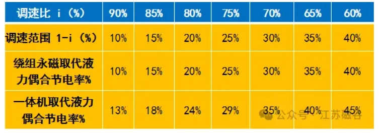 【繞組永磁調速高節電性能】 繞組永磁調速的原理就是將發熱轉差功率用永磁轉差發電技術來回收轉差能量。繞組永磁調速具有高節電性能:永磁一體就是將永磁電機和繞組永磁調速器嵌套集成的雙永磁調速電機。 1)繞組永磁調速同工況取代液力偶合調速器節電率見下表: